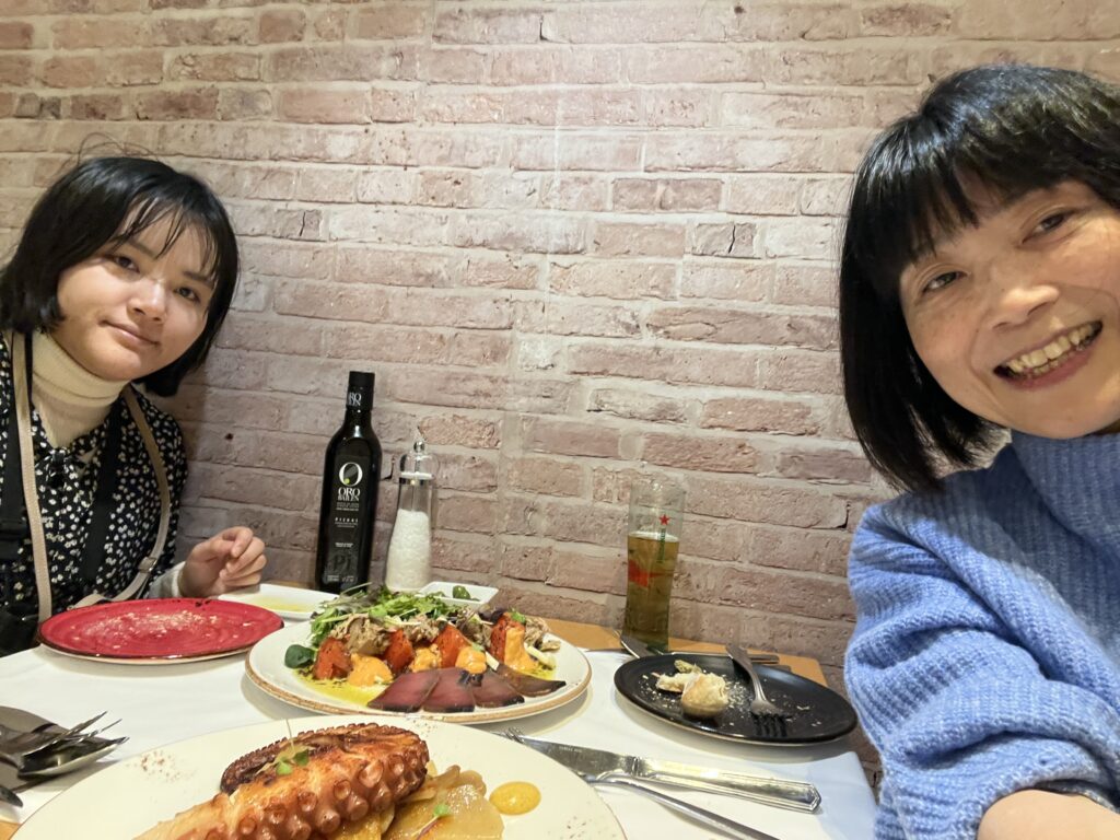 西島さんとホテル近くのレストランで夕食。大好きなタコのグリルなど、西島さんが引くほど食べまくりました。